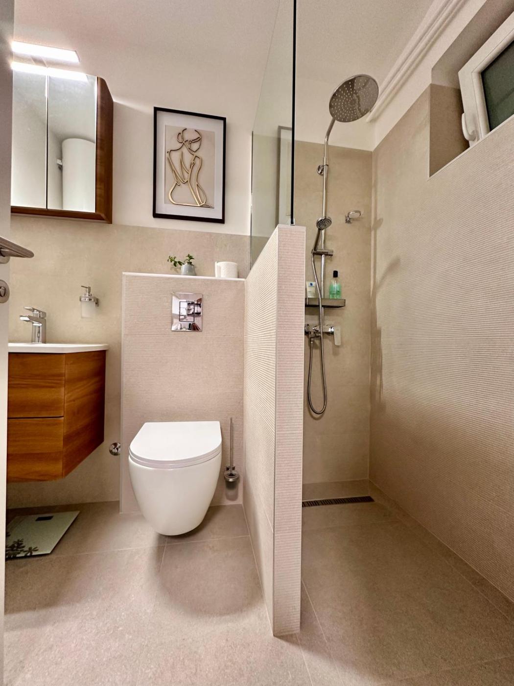 One-Bedroom Apartment. This apartment comprises 1 living room, 1 separate bedroom and 1 bathroom with a walk-in shower and free toiletries. Meals can be prepared in the well-fitted kitchenette, which comes with a stovetop, a refrigerator, a dishwasher and kitchenware. The air-conditioned apartment provides a flat-screen TV with streaming services, a washing machine, a tea and coffee maker, a seating area as well as city views. The unit offers 2 beds.